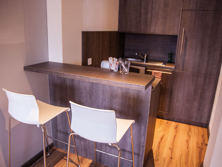 Bar, Geschirrspüler, Kühlschrank, modernes Bad mit barrierefreier Dusche und WC, Couch, bequemes Bett bzw. Boxspring-Bett, grosser Besprechungs- oder Schreibtisch für bis zu 4 Personen, kostenloses W-LAN, Flatscreen, Tiefgaragenparkplatz. 2 Appartements sind inkl. Küchenausstattung.